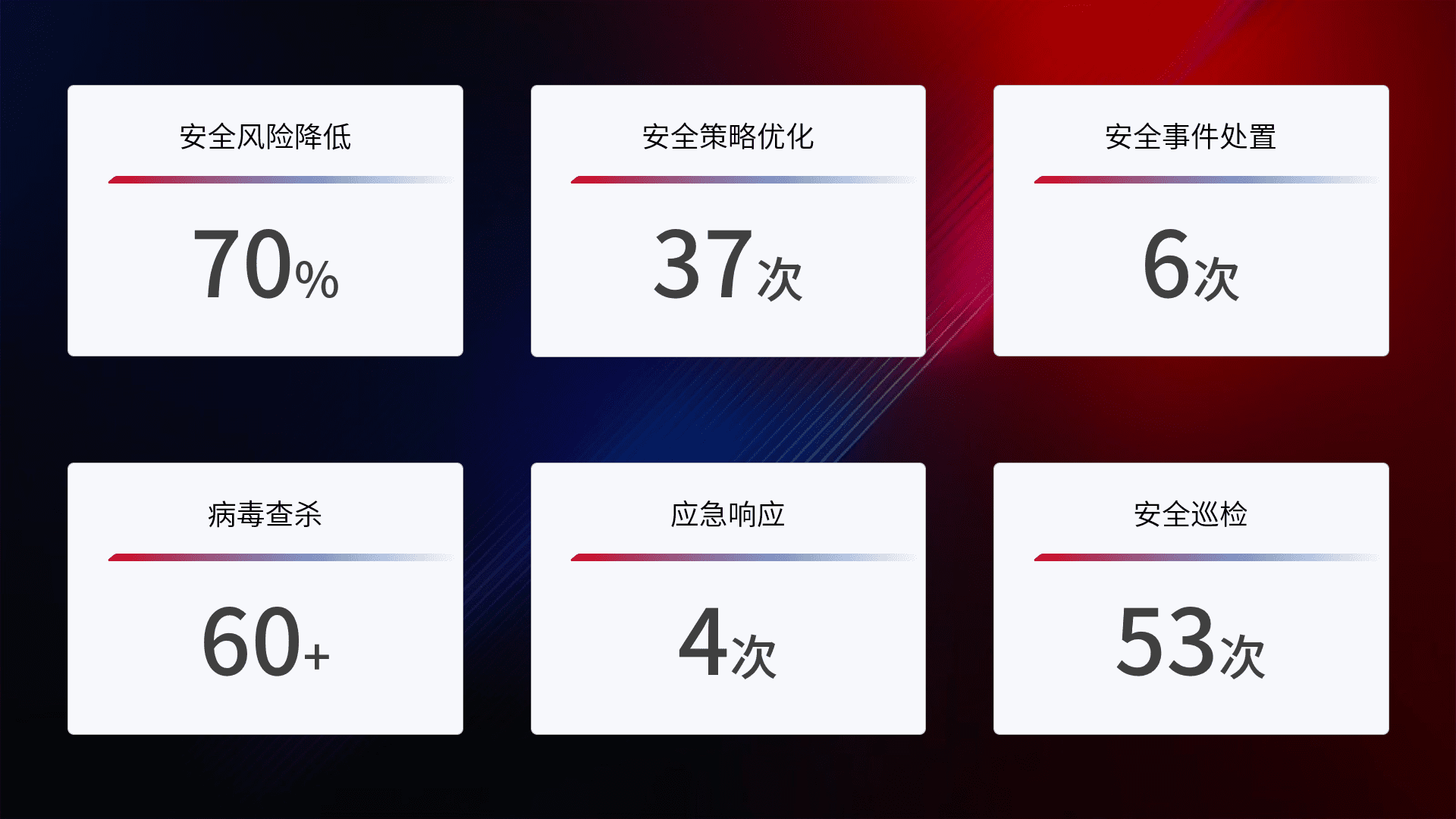 提供全面的安全事件报告体系,,包括处置报告、、周报、、季度和年度总结,,结合持续监控,,,,帮助客户深入了解网络安全状况。。。